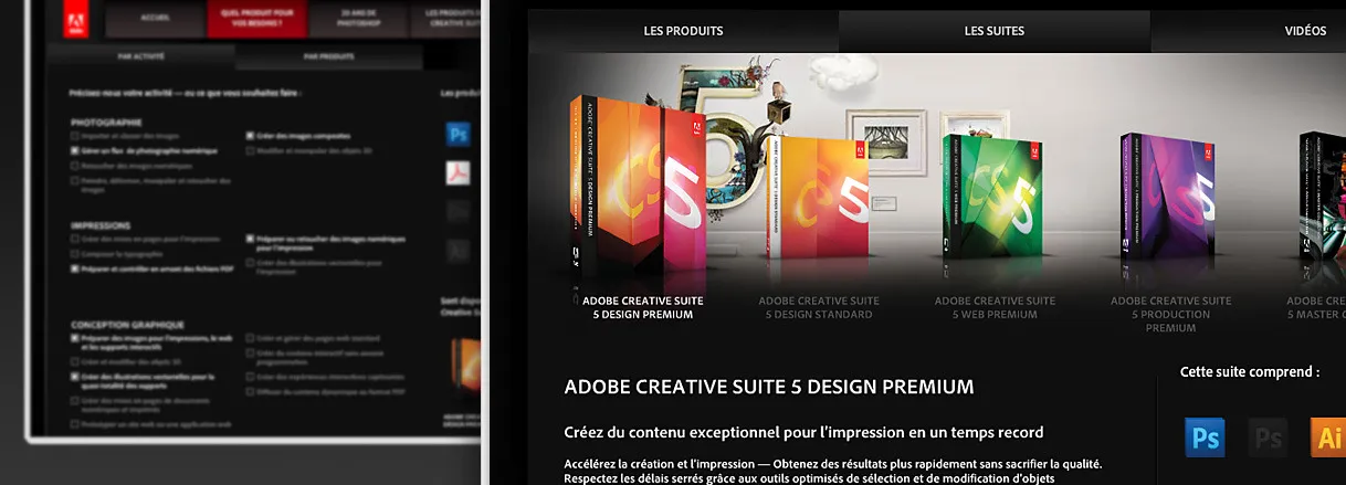 FNAC is the French leader in the distribution of cultural and leisure goods. This mini site created for Adobe presents all the CS5 products, through choice aids, detailed sheets and numerous videos.