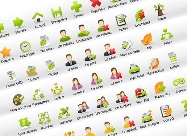 General graphic design of Heredis 11, the reference software in genealogy. Variation on all elements, from packaging to interface screens. Creation of more than a hundred software icons.