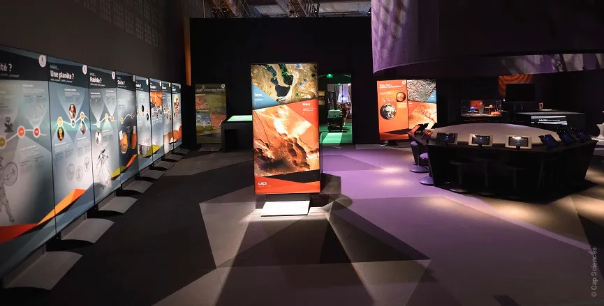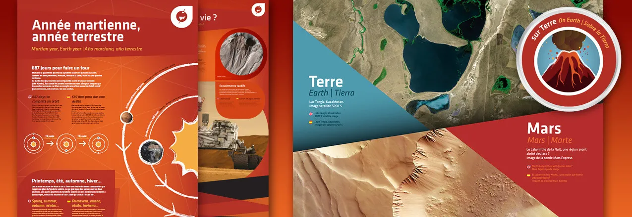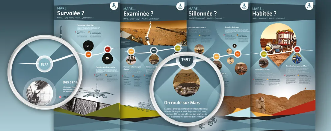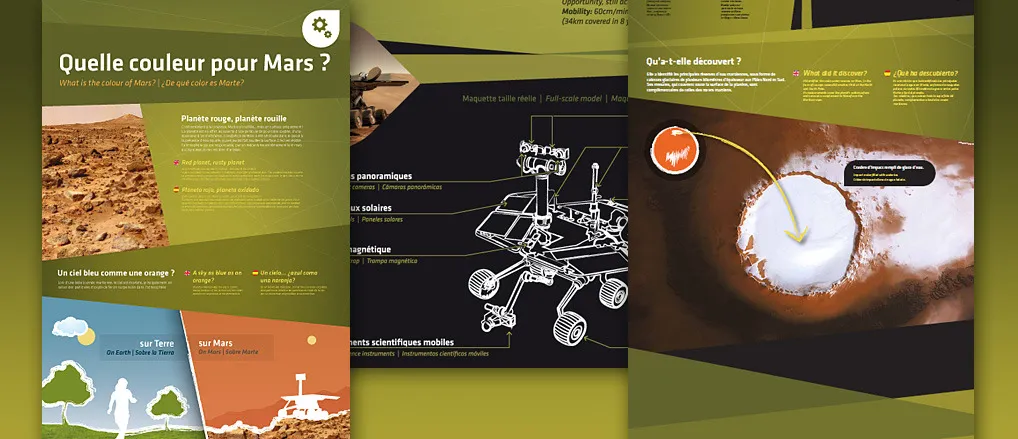 Graphic design of the Mars travelling exhibition for the Cité de l'espace, Parc de l'aventure spatiale in Toulouse. How do Mars rovers work? What do we know about Mars? What are the differences between Mars and Earth? Discover this mysterious planet that is making space news at the beginning of the 21st century...