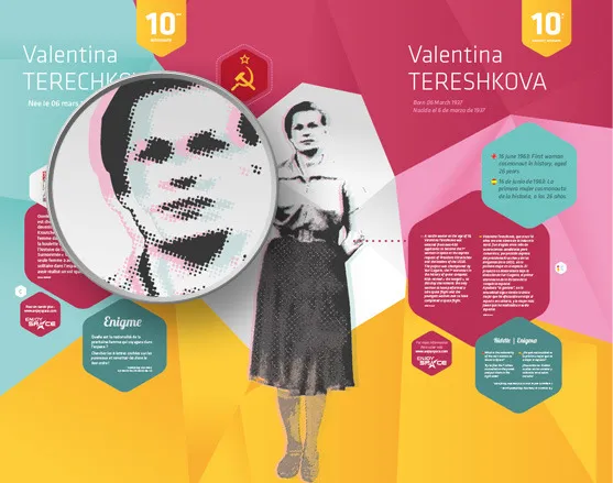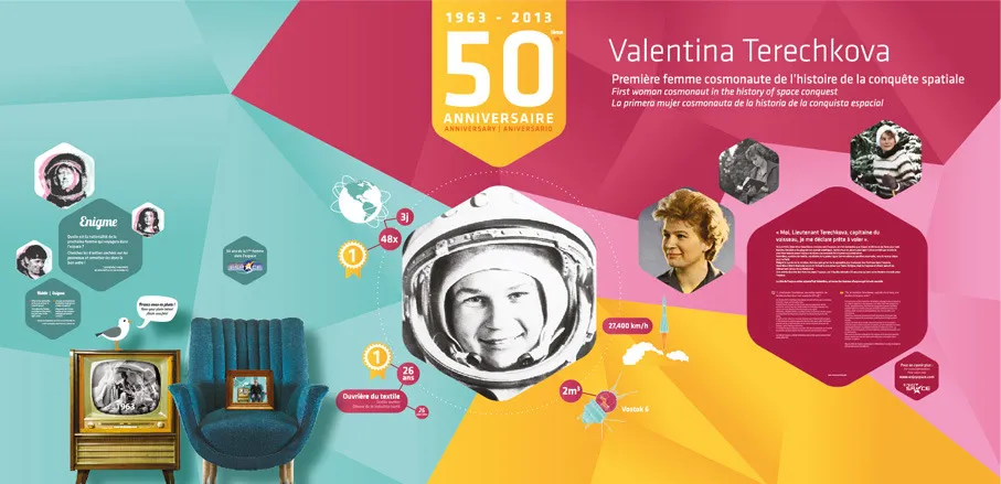Graphic design of the temporary exhibition "Valentina" at the Cité de l'espace, Parc de l'aventure spatiale in Toulouse. On the occasion of the fiftieth anniversary of the first woman in space (1963-2013), the Cité de l'Espace has created this exhibition paying tribute to Valentina Tereshkova, who was the first, but also to all the others who have followed her for half a century.