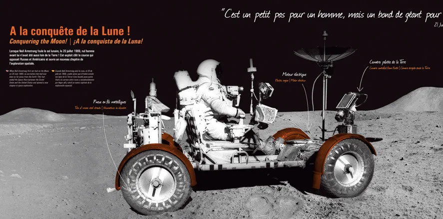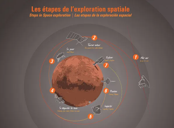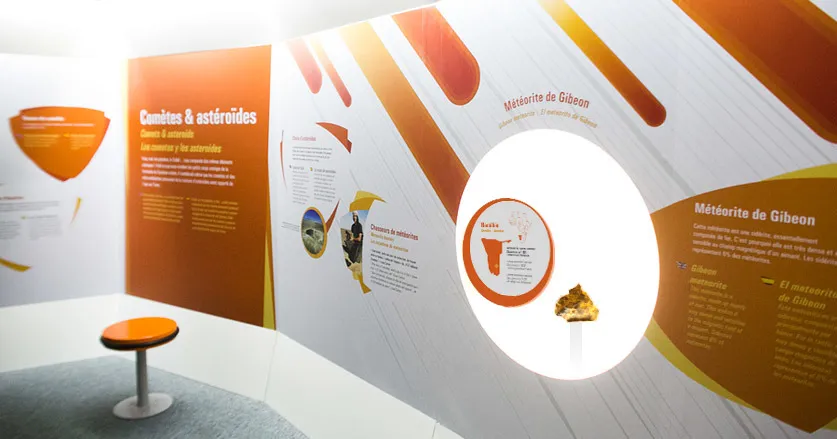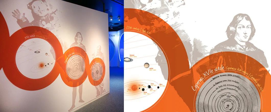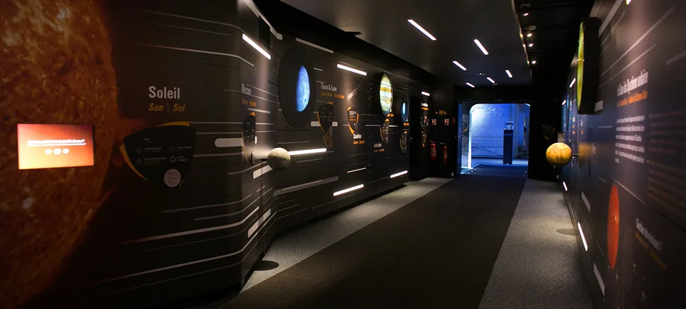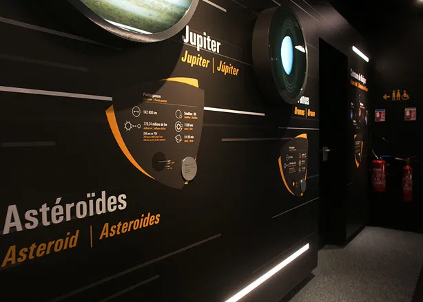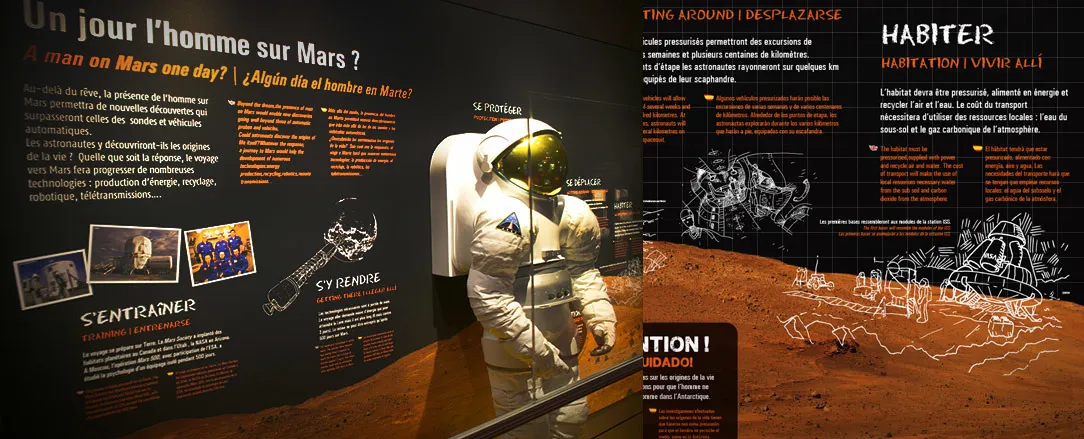 Graphic design of the permanent exhibitions of the Cité de l'Espace, Parc de l'aventure spatiale in Toulouse. On more than 450 m2, the Quai du système solaire, takes the visitor on a journey through our solar system and beyond! In particular, it presents the Lunar and Martian missions as well as life on board the ISS.
