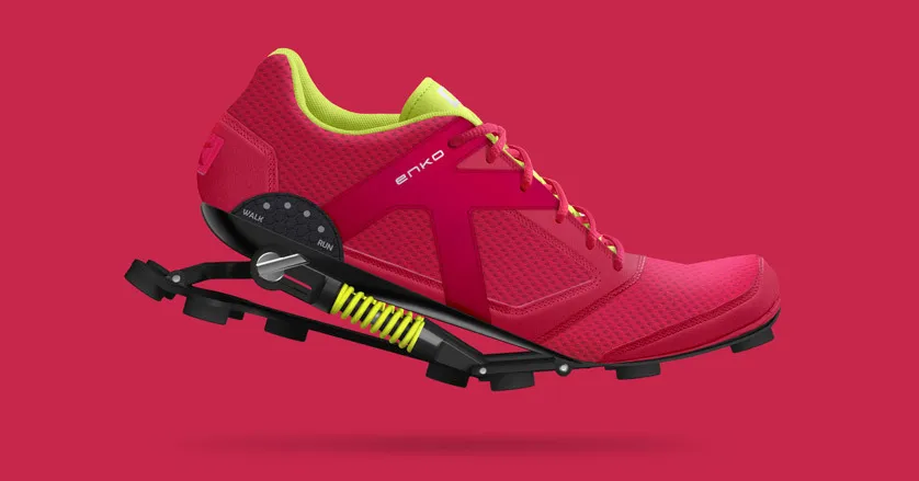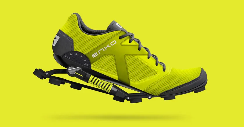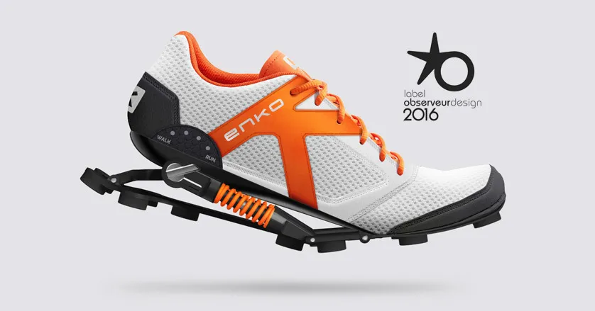 Design of an innovative running pair. This unique shoe features two shock absorbers and an articulated sole for unprecedented comfort. It absorbs shocks like no other shoe to preserve the runner's joints, and guarantee comfort that pulverizes current standards. In addition, Enko restores all the energy stored with each stride with its two shock absorbers. With a classic shoe, when your foot hits the ground, energy is dispersed and entirely lost. Conversely, Enko stores energy, stores it, and releases it when you lift your heel off the ground. We made the design of the shoe as well as the range of colors, but also the brand's logo, its website, the crowdfunding campaign site (Indiegogo) and a presentation film. The crowdfunding campaign was a success: it made it possible to finance the project at more than 150% with more than 100,000 dollars raised! Enko running shoes have been awarded the 2016 Observeur du Design Label. L'Observeur du design is an international design prize that identifies and rewards the most innovative work in terms of design and innovation each year. The shoe is available for sale on the Enko website.