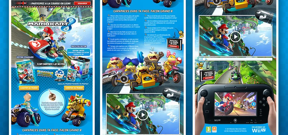 On the occasion of the release of the Mario Kart 8 game, Fnac has ordered us this web mini-game, which takes up the universe of the famous character. At the controls of your kart, drive with finesse, grab power-ups, avoid penalties... Try to beat the best in the overall standings or just play against yourself!
