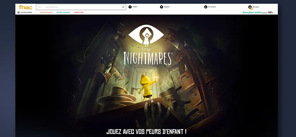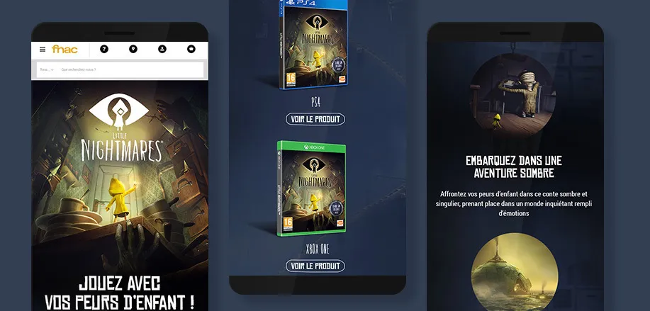 This page created for fnac.com immerses you in the world of the game Little Nightmares, a dark and whimsical tale with superb aesthetics! We highlighted the product and its very particular visual universe by integrating videos, HTML5 animations and interactive content within this responsive desktop and mobile web page.