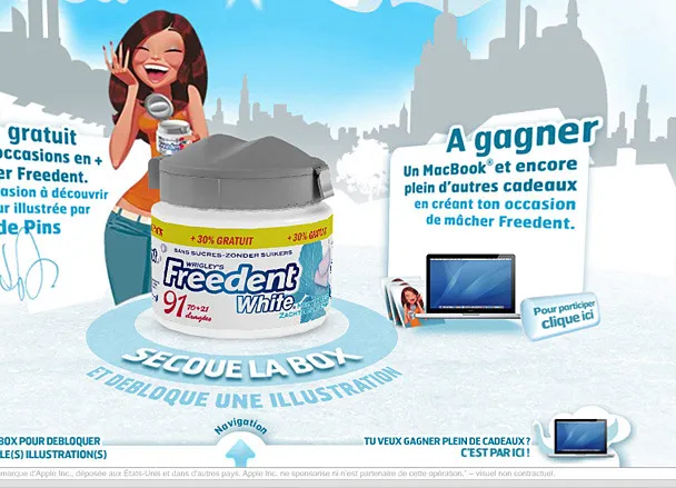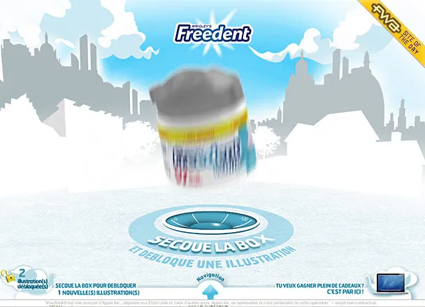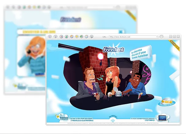 Flash programming and backoffice of a site mixing animations and illustrations in a fully 3D universe (BBDO art direction). Shake the box to discover 20 illustrated Freedent chew opportunities and enter the big contest by submitting your scenario! Awarded by Favorite Website Awards!