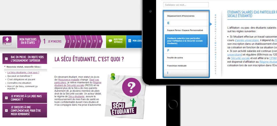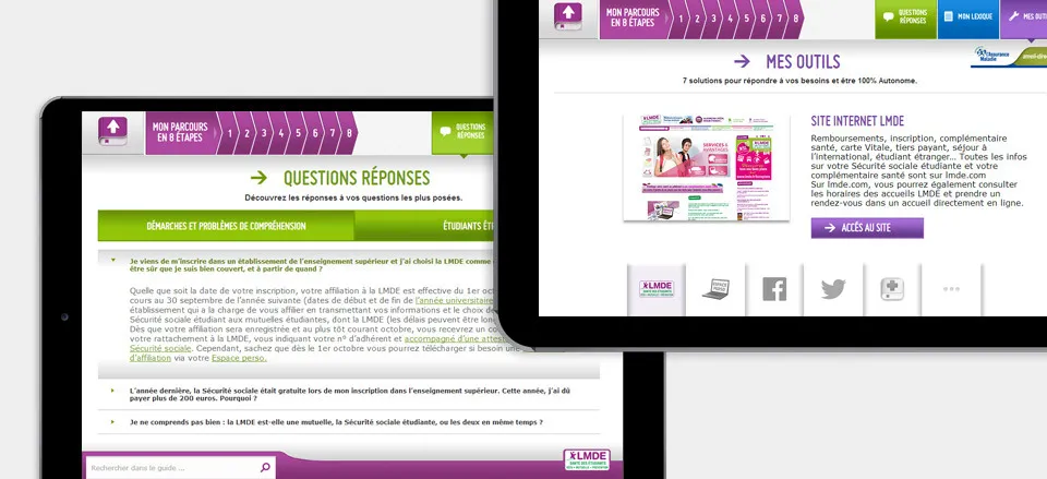 The LMDE Practical Guide has been designed to guide members in their health procedures. It describes the different stages of the health pathway, as well as a complete lexicon of Social Security and mutual insurance. Cubedesigners was responsible for the development of the application. Project carried out in partnership with the New BBDO agency.
