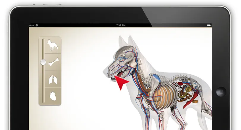 Design and programming of an iPad application to support veterinarians in explaining to their clients the pathologies or interventions performed on their dog or cat. This is done through a set of videos, one for each pathology. And a 3D model to display the animal's organs and/or skeleton, from the desired angle, with the possibility of drawing or annotating the view.