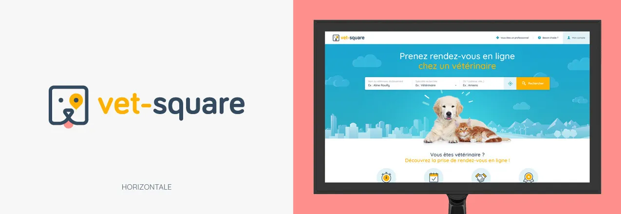 Vet-square allows individuals to find a veterinarian and make an appointment. Creation of the logo, the graphic charter, and all the digital communication.