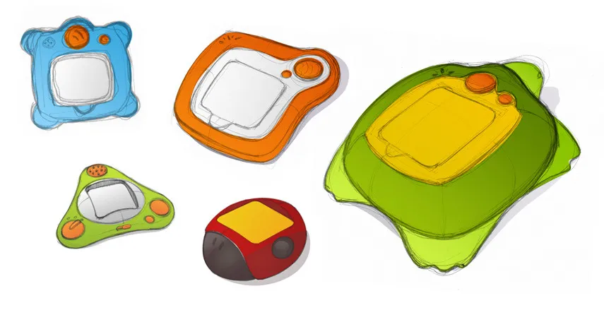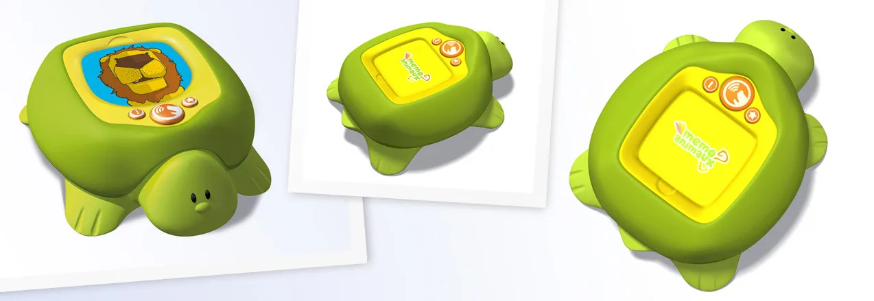Design of an interactive memory game For this product, the publisher wanted to create a game that works on memory, around animals, for children from 3 years old. Among our proposals, that of the turtle quickly stood out: both emotionally charged and adapted to use from an ergonomic point of view. Firmly planted on her feet, she receives the playing card on her shell. We carried out the initial sketches and research, the detailed design, the 3D modelling and the manufacturing plans. We also made the product logo.